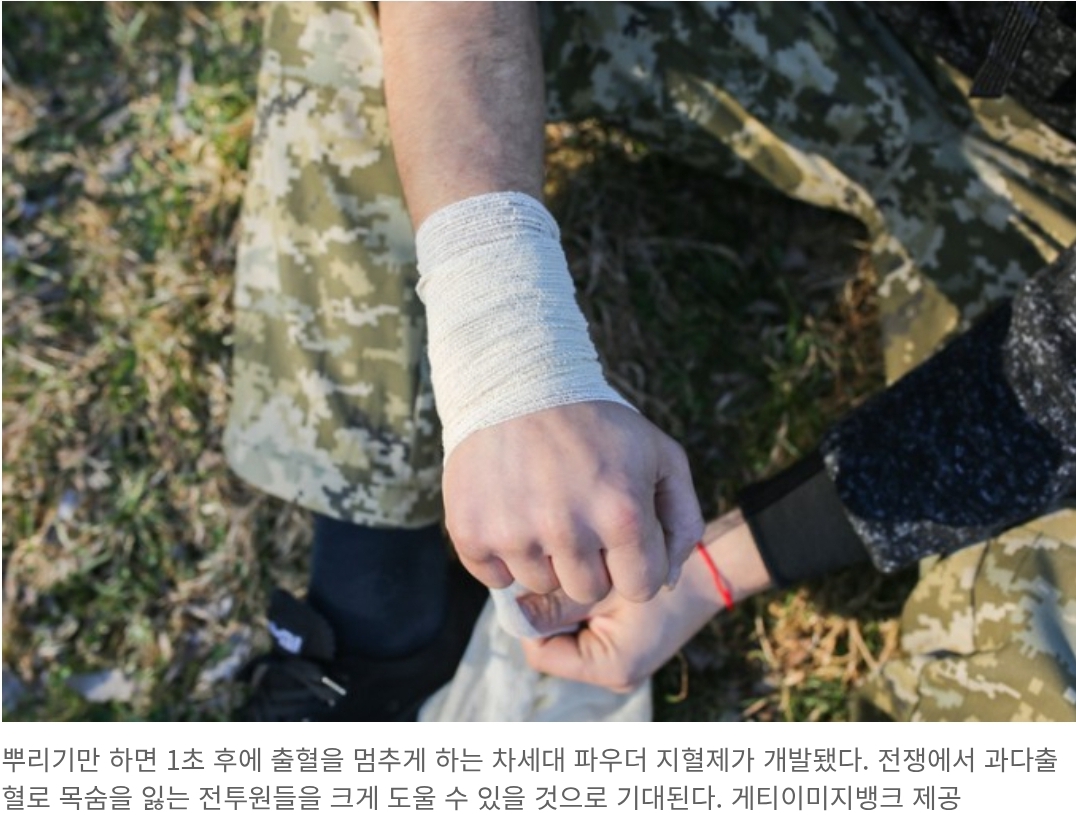 요약 : 뿌리기만 하면 1초안에 출혈이 멈추는 파우더 지혈제가 KAIST에서 개발되었다고 밝혔다. 그동안 의료현장에서 사용되던 패치형 지혈제는 복잡한 상처에 적용이 어렵고, 온도와 습도의 영향을 많이 받아 사용에 어려웠다. KAIST에서 이번 개발한 것은 파우더 하나로 다양한 상처에 대응할 수 있게 보완한 것이다. 기존 지혈제는 물리적 흡수를 이용하였기에 한계가 있었지만, 이번 발표한 지혈제는 혈액속 이온반응을 이용한 방식으로 만들었다. 이것은 생체적합 소재를 결합한 구조로 AGCL 파우더를 만들었다. AGCL 파우더는 혈액 속 양이온과 반응하여 1초 안에 겔 상태로 상처를 밀봉한다. 파우더는 3차원 구조를 형성하여 자체무게 7배 이상의 혈액을 흡수한다. 구조 덕분에 고압, 과다출혈 상황에도 혈류를 쉽고 빠르게 차단하며, 뛰어난 밀폐 성능을 보였다. 이 파우더는 용혈율 3% 미만, 세포 생존율 99% 이상, 향균 99.9% 이상으로 안전함 까지 보장했다. 또한, 온도와 습도의 영향을 적게 받아 최대 2년까지 성능이 유지되어 열악한 환경에서도 즉시 사용 가능하다. 이 기술은 전시 응급처치부터 체내 수술 지혈까지도 돕기에 국방기술이 민간까지 확장된 대표적인 스핀오프 사례이다. 스핀오프란, 국방기술을 민간 영역에 활용하기 위해 확장, 이전한 것이다. 이 기술에는 육군 소령 연구진이 직접 참여해 실제 전시상황을 고려해 실전형 기술로 완성도를 높였다.